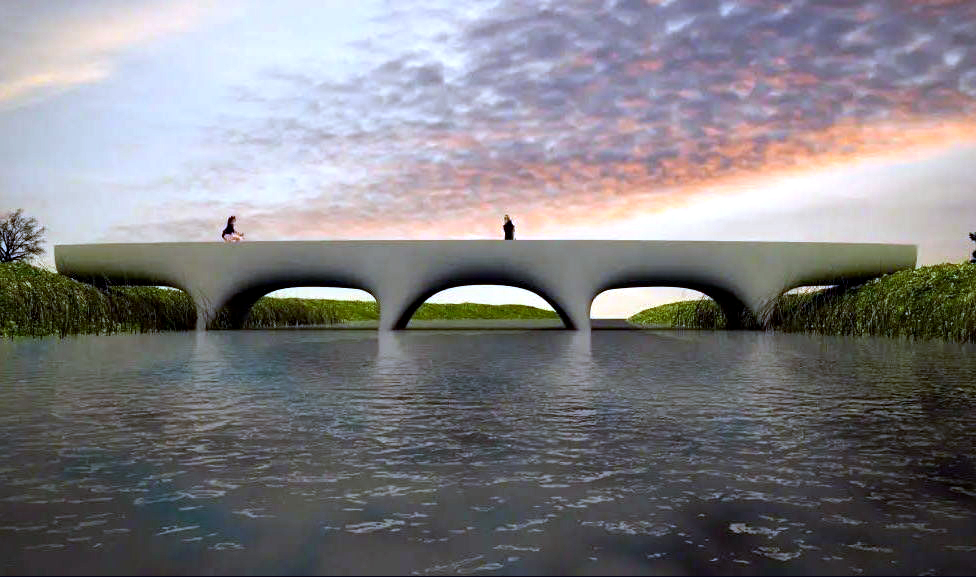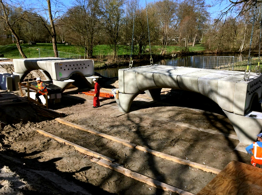 该座桥梁分三段,每段都由3D打印机单独打印完成。在施工现场,将这些桥段作为施工套件拼装一起。